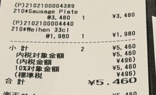 ビールとソーセージとポテトで合計¥5,460円也。。。