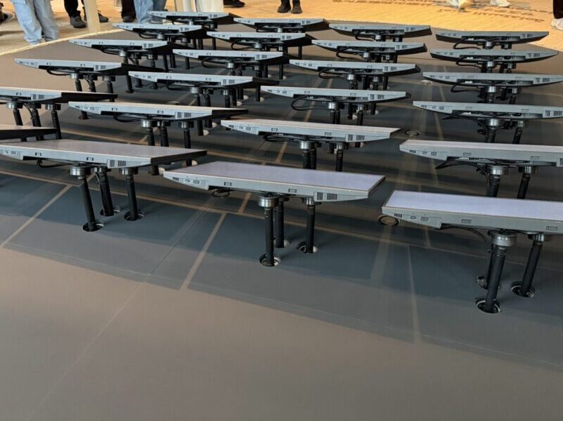 床から伸びているシャフトが伸び縮みしてディスプレイの角度を変えているみたいですね。